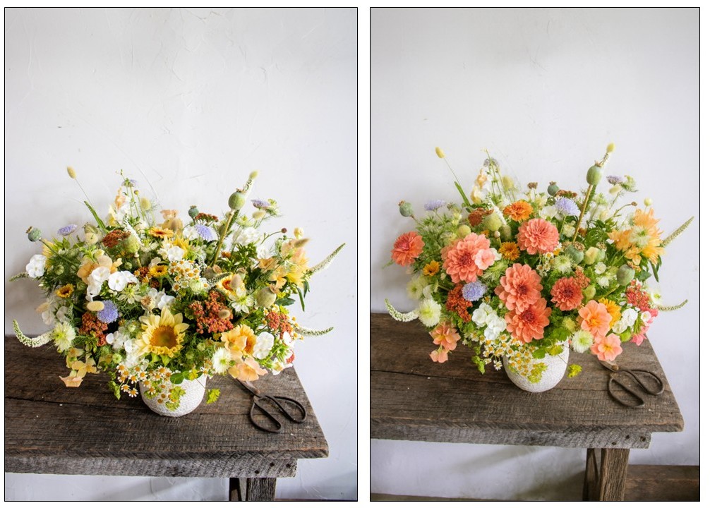 You can upload an image of your own (or the client’s) and prompt AI to replace certain flowers in the design. In the images below, the one on the left is the original and AI was prompted to “Replace sunflowers with coral dahlias while keeping the same vase, composition and natural lighting.” The image on the right is the result.